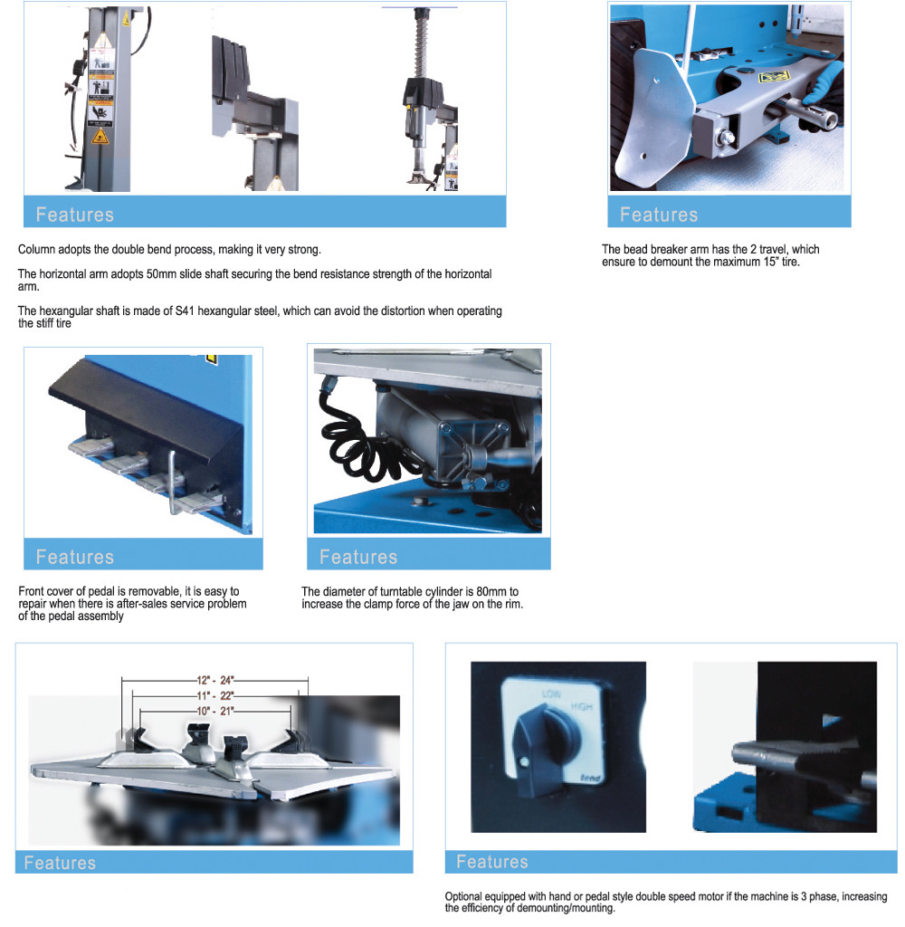 8) اختياري مجهز بمحرك مزدوج السرعة بنمط اليد أو الدواسة إذا كانت الماكينة ثلاثية الأطوار ، مما يزيد من كفاءة الفك / التركيب.